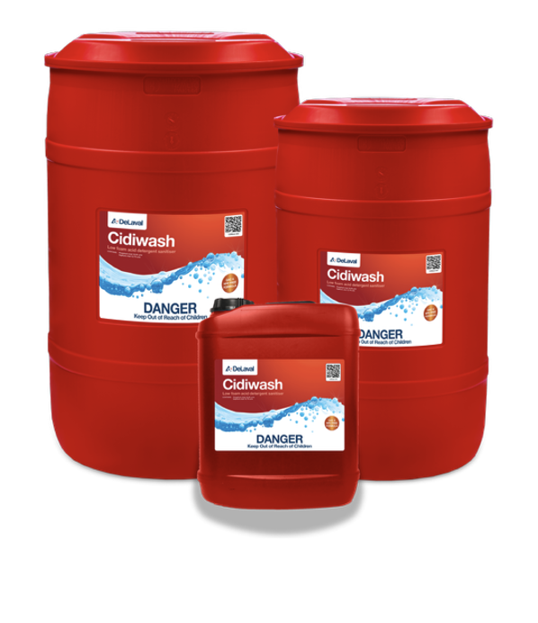 Cidiwash is a low foaming acid detergent that cleans well in most water types specially formulated to give you the best value for money without comprising quality. Cidiwash contains two different acids to ensure milkstone, iron, and minerals do not build up, with a powerful non-QAC sanitiser that leaves no detergent residues after rinsing.